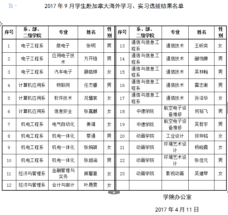 根据《上海电子信息职业技术学院2017年9月赴加拿大温哥华岛大学“学生海外学习、实习”项目实施方案》的相关要求,各相关系、部、二级学院在学生自愿申请的基础上,经过学科成绩审核、综合素质评分及面试等遴选程序后,共选拔产生23名学生。现将具体名单予以公示。如有异议,请在公示时间内向学院办公室反映。