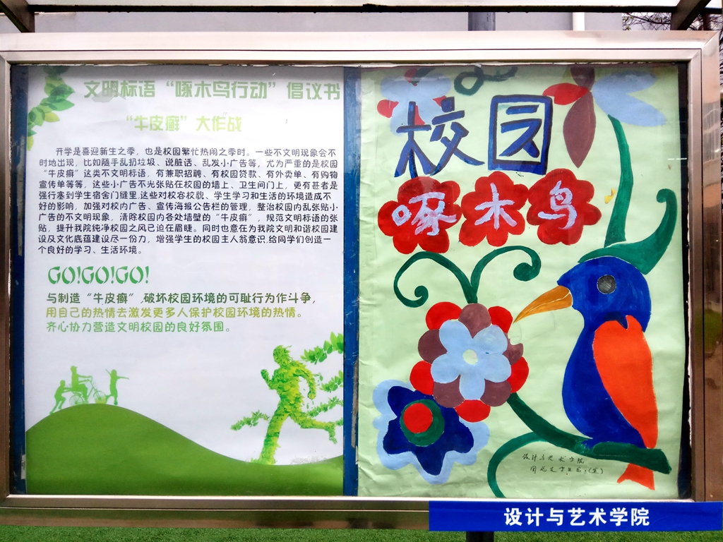 活动前夕,设计与艺术学院团总支学生会的同学分头对全校各个区域进行清洁度的勘察,并作好记录。活动当天,在生活园区以张贴和发放倡议书的形式进行“啄木鸟行动”宣传,向全校师生发出倡议,呼吁大家倡导校园文明,并在活动中以问卷调查的形式让大家思考校园“牛皮癣”产生的原因,并切实看到校园“牛皮癣”带来的负面影响。学生们表达了自己的态度,并表示希望加入到本次活动中,做文明校园行动的倡导者与践行者,同时给出了良好的整改建议。在当天的活动中,学生会同学还将广大志愿者分成四组,并带领大家分别在生活园区和教学园区进行校园“牛皮癣”清除行动,达到了预期目标,受到了广泛好评。