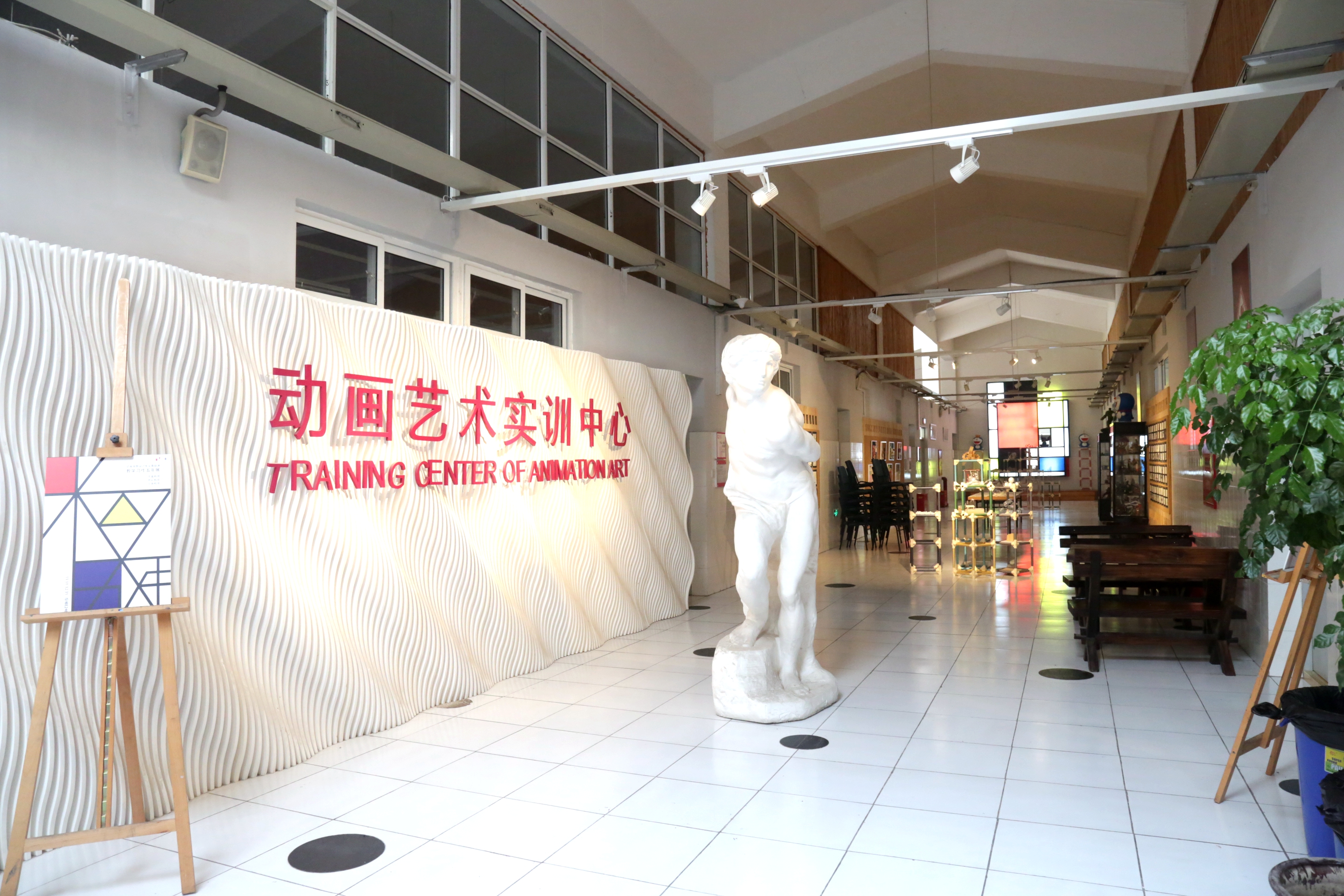 设计与艺术学院艺术实训中心走廊文化以活泼、轻松、充满艺术感的形式而呈现。楼梯正上而对的是米开朗基罗的作品《被俘的奴隶》,屋顶的天光在上午课间时分照在雕塑上,产生的光影增加了教学场地的艺术氛围。正对走廊的是以蒙德里安的红黄蓝构图而改版的灯箱和LED荧屏,不同色的灯光在地砖和墙砖上产生教堂一般的视觉感受。沿着墙体两侧是胶卷形式的软木板,不仅可以有展示、告知等作用,还隐含着设艺学院与影视作品的关系。绿色盆景、休闲艺术座椅、全体教师的肖像漫画、历年的毕业照、学生作品展示,这些都让设艺学院的走廊无论是在视觉上还是触觉上都会产生丰富的感受。